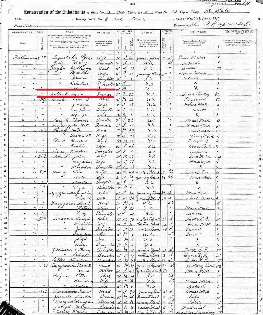 4. 1915 New York State Population Census, ; Page 14, Agnes Kotlarek – Boarder, Buffalo Ward 10; County: Erie, New York State Archives, Albany, New York.