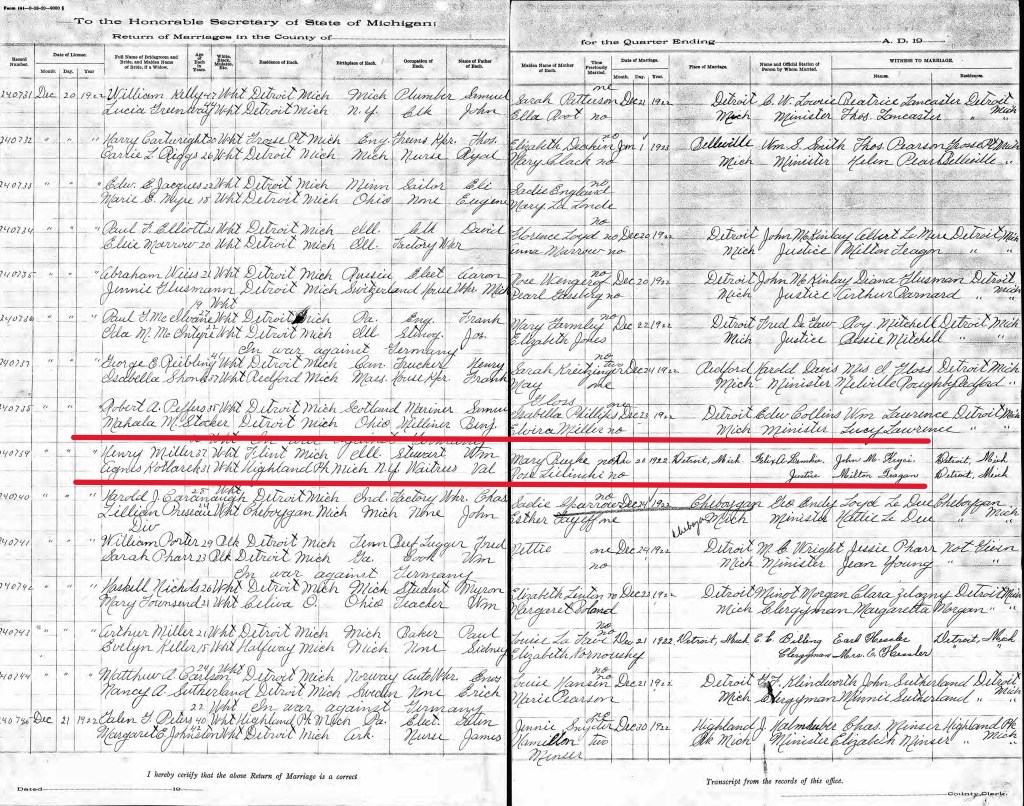 6. Michigan, Michigan Department of Health and Human Services, Marriage Records, No. 240739, The Kotlarek-Miller Marriage, 1922;Michigan Department of Health and Human Services, Lansing, Michigan.