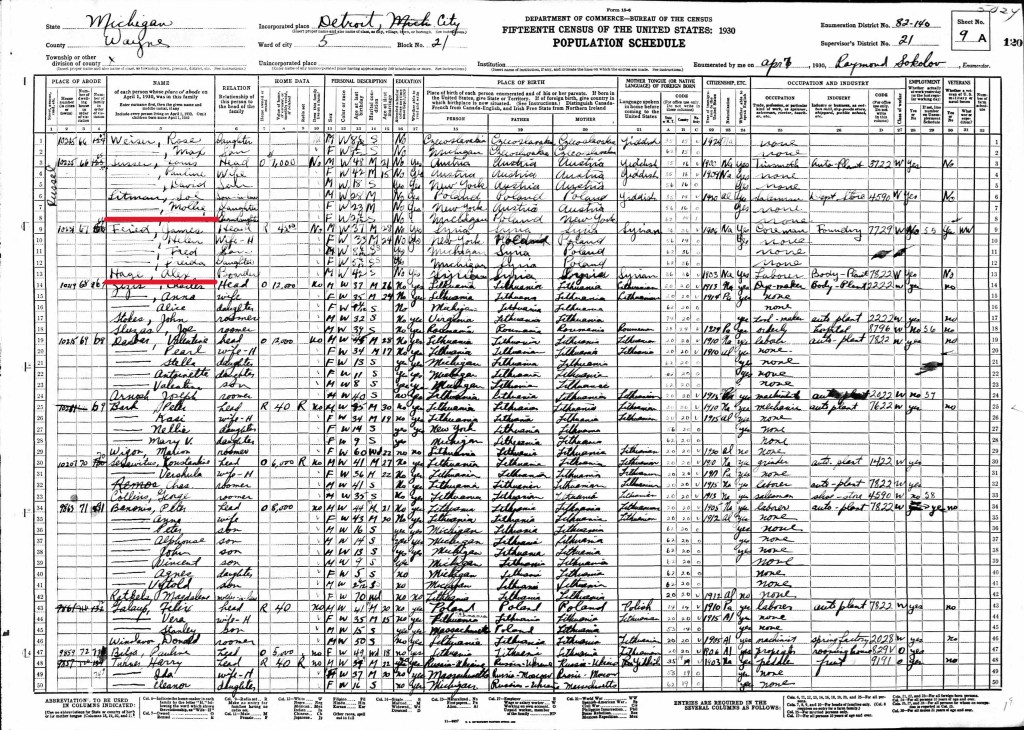 8. The James Feied Household, 1930 United States Federal Population Census, population schedule, Detroit, Wayne, Michigan, Page 9A, Enumeration District (ED) 140, Dwelling No. 67; Family No. 66; Microfilm Publication: T626; 2,667 Rolls.