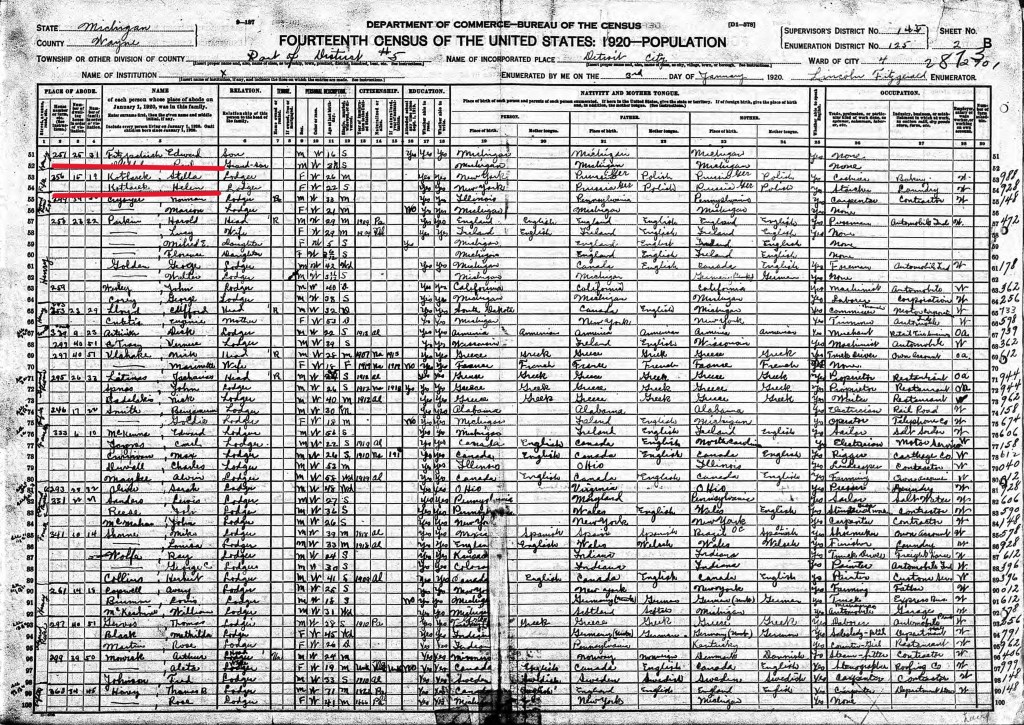 7. Helen Kotlarek – Lodger, 1920 United States Federal Population Census, , population schedule, Detroit Ward 4, Wayne, Michigan, Page 2-B, Enumeration District (ED) 125, Dwelling No. 15; Family No. 19; Microfilm Publication: T625; 2,076 Rolls Record Group 29, Roll: T625_805.