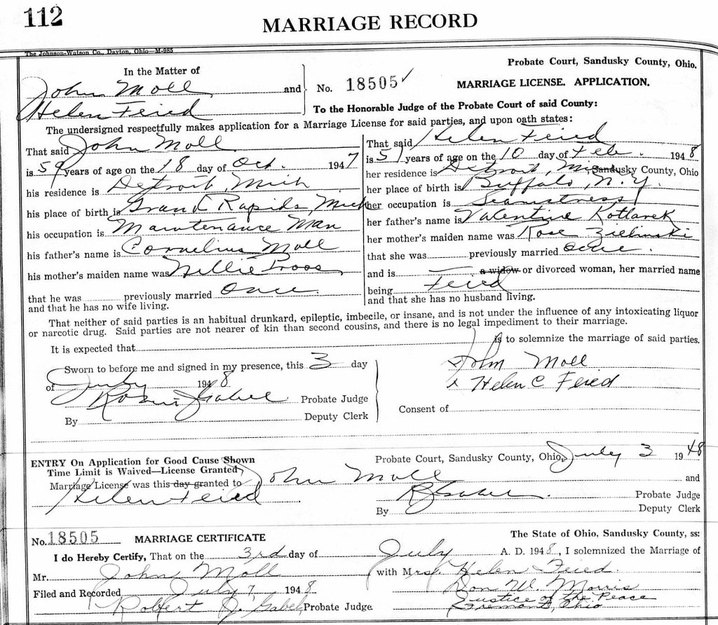 12. Ohio Marriage Records: Page 112, No. 18505, The Feied-Moll Marriage.