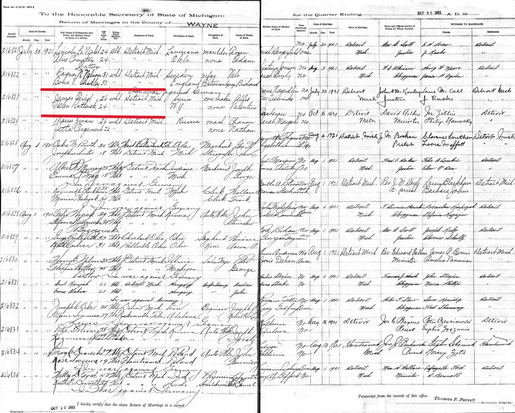 11. Michigan, Michigan Department of Health and Human Services, Marriage Records, No. 216823, The Kotlarek-Feied Marriage, 1921;Michigan Department of Health and Human Services, Lansing, Michigan.
